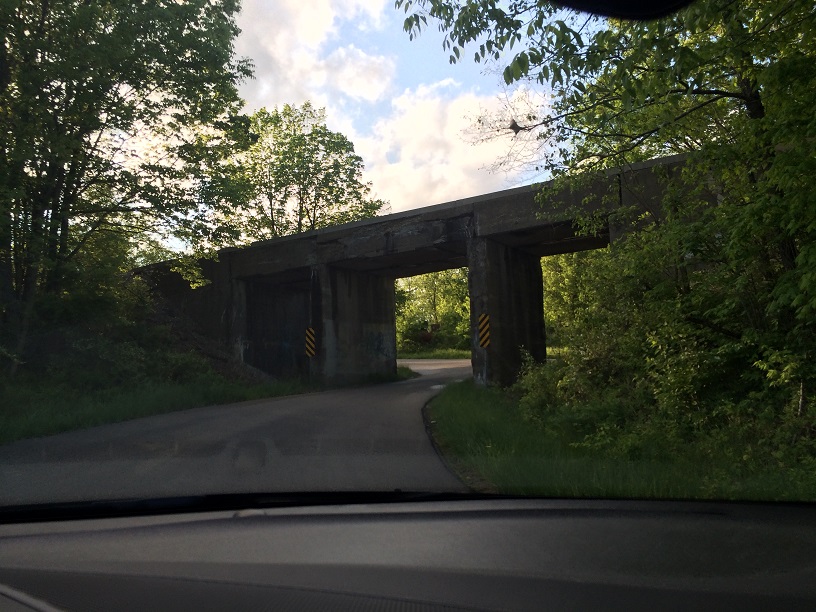 While on Elwren Rd, after 1.7 miles, you will go under a one lane railroad bridge